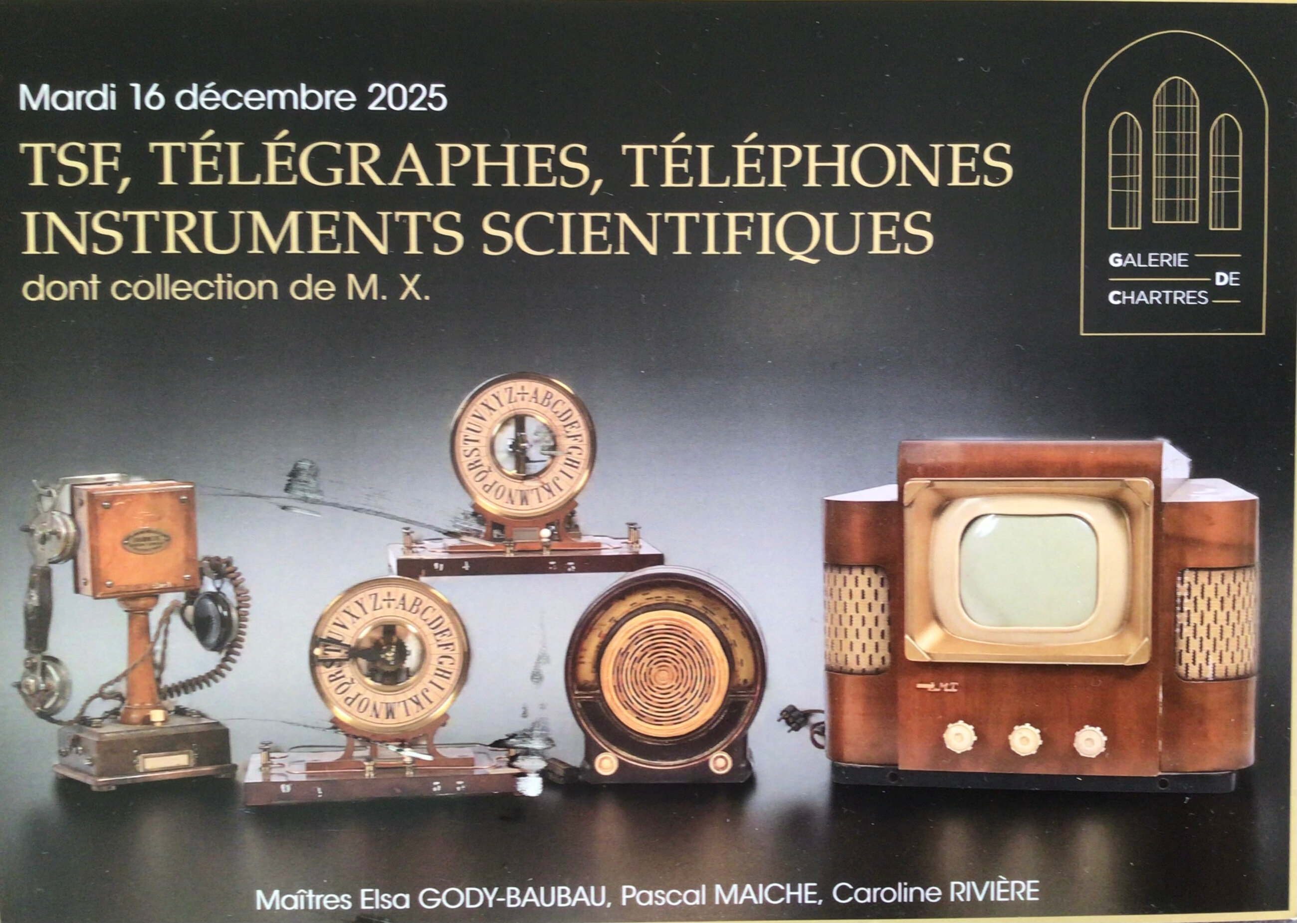 La dernière vente TSF.TELEPHONES.INSTRUMENTS SCIENTIFIQUES se déroulera a LE COUDRAY, donc pas à la galerie de Chartres, le mardi 16 décembre 2025. Voici la fiche de cette vente , le détail étant récupérable sur le net comme d’habitude. Les résultats apparaîtront 24 heures après les adjudications.