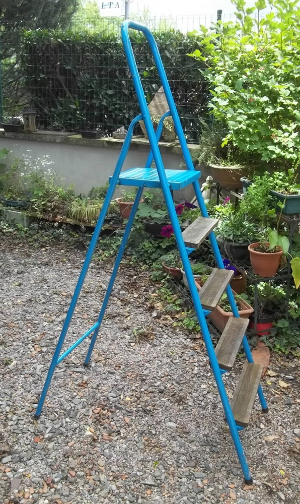 Une fois, j’ai trouvé cet escabeau, en bon état , mis dans une benne ! (pourquoi l’ont il jeté ? C’est pourtant très utile, un escabeau, pour relamper ses luminaires ! )