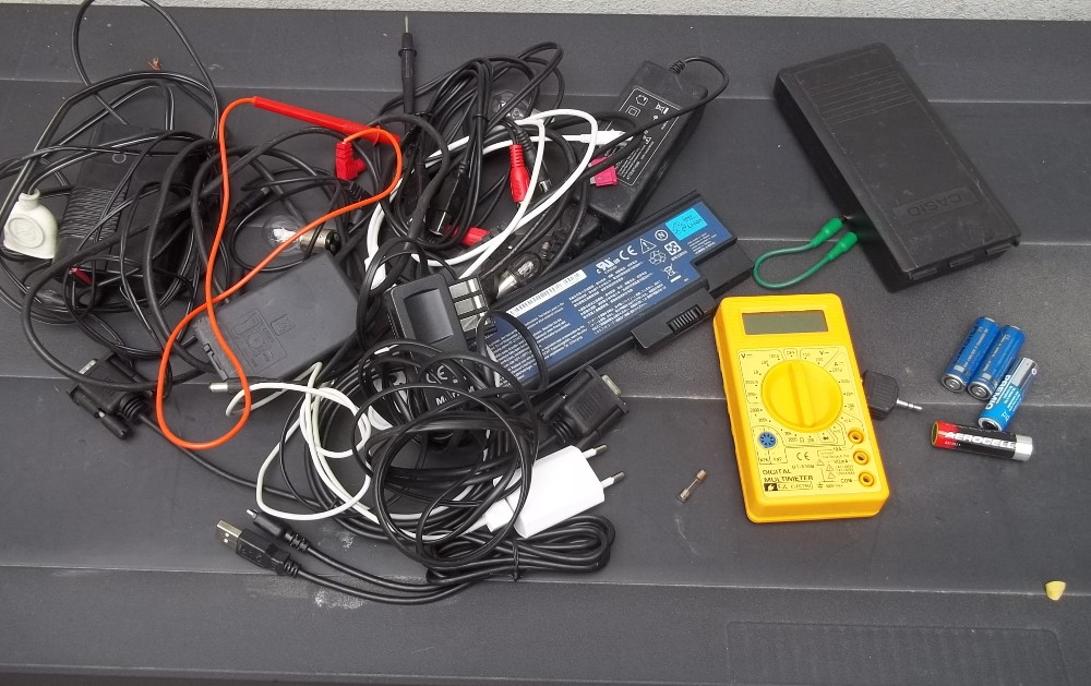 Un lot de divers cordons électriques et informatiques, et divers matériels électroniques : batterie lithium de P.C portable, gradateur de lumière a triac, chargeurs de téléphone portable, calculatrice, divers accessoires pour l’ informatique …Et le fameux multimètre DT830 spécial intervention dans les TGBT ! (je plaisante !)