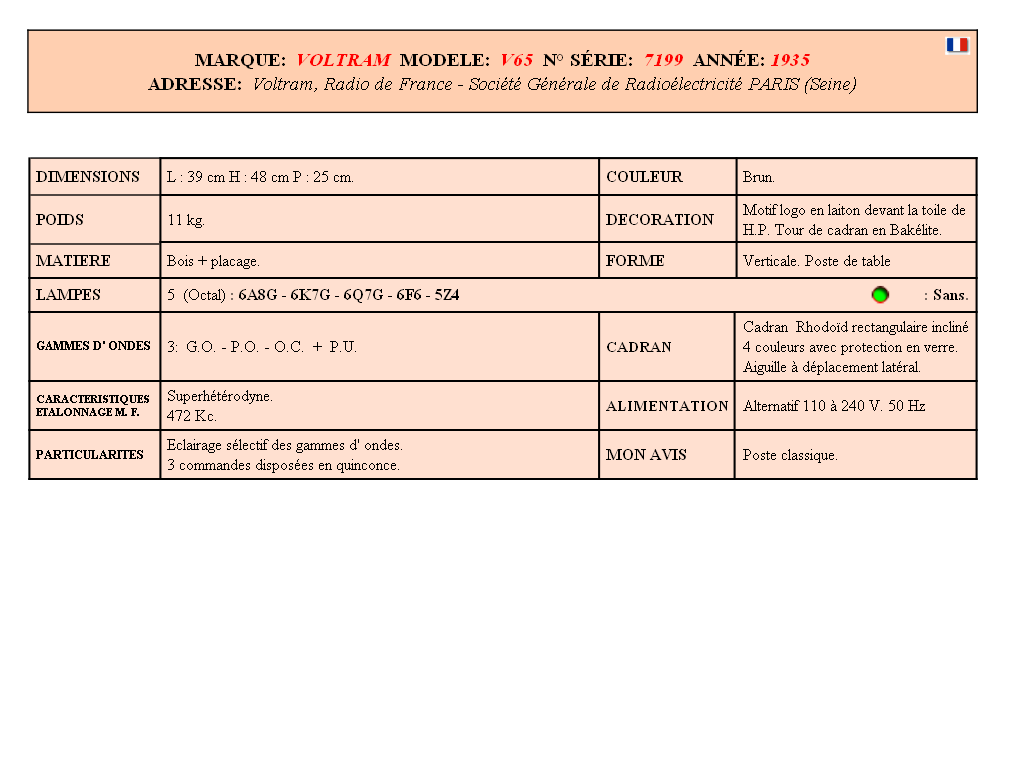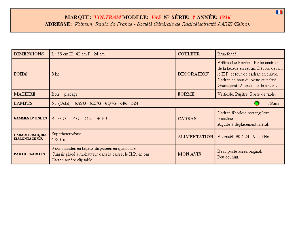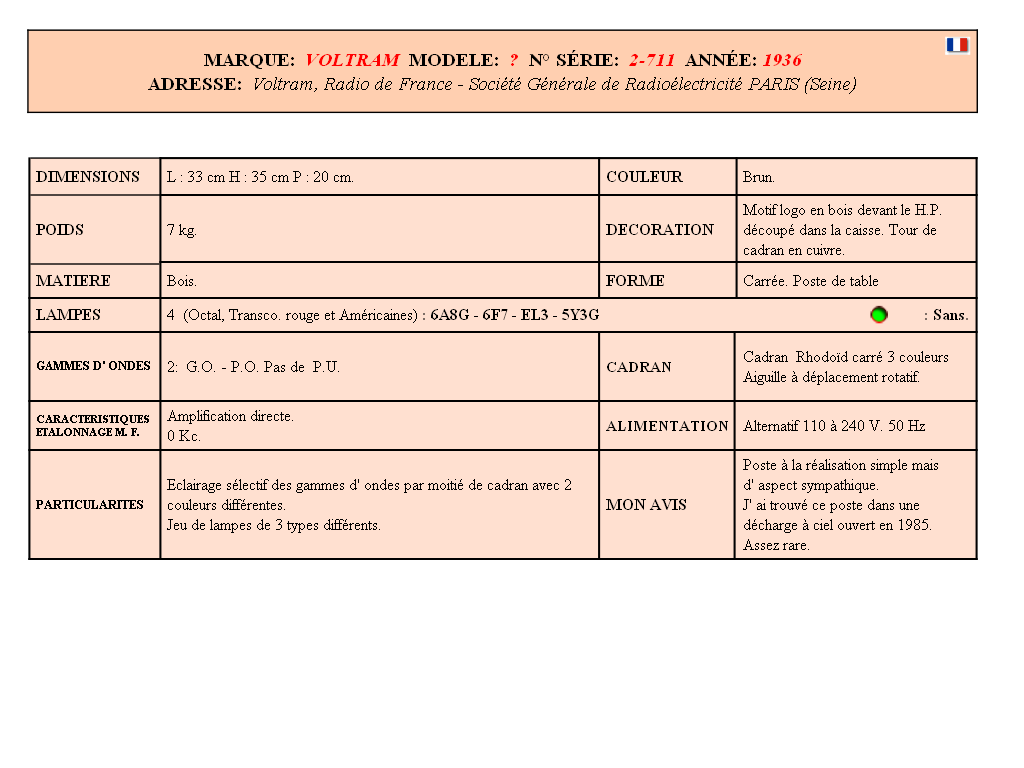 Bonjour, appel à @Jean-Marie59 je possède un VOLTRAM identique et non moins inconnu, car dépourvu de carton arrière. Son numéro de série est 39003. La grosse différence est qu’il s’ agit d’un push-pull (+ 1 6F6 et + 1 6F5 déphaseuse. Le haut-parleur est plus gros (diamètre extérieur 25 cm). Jean-Marie59, ou un autre collectionneur qui comme moi n’ a pas encore déclaré son poste, possède-t-il des photos du câblage et le numéro de série ?