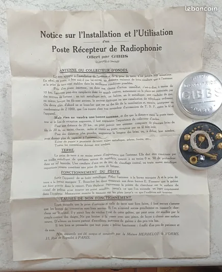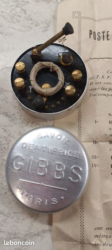 Poste à galène ( complet avec sa notice d’époque !) Objet publicitaire de la marque GIBBS Encore dans son papier de soie (HS !!) Pas d’écouteurs.