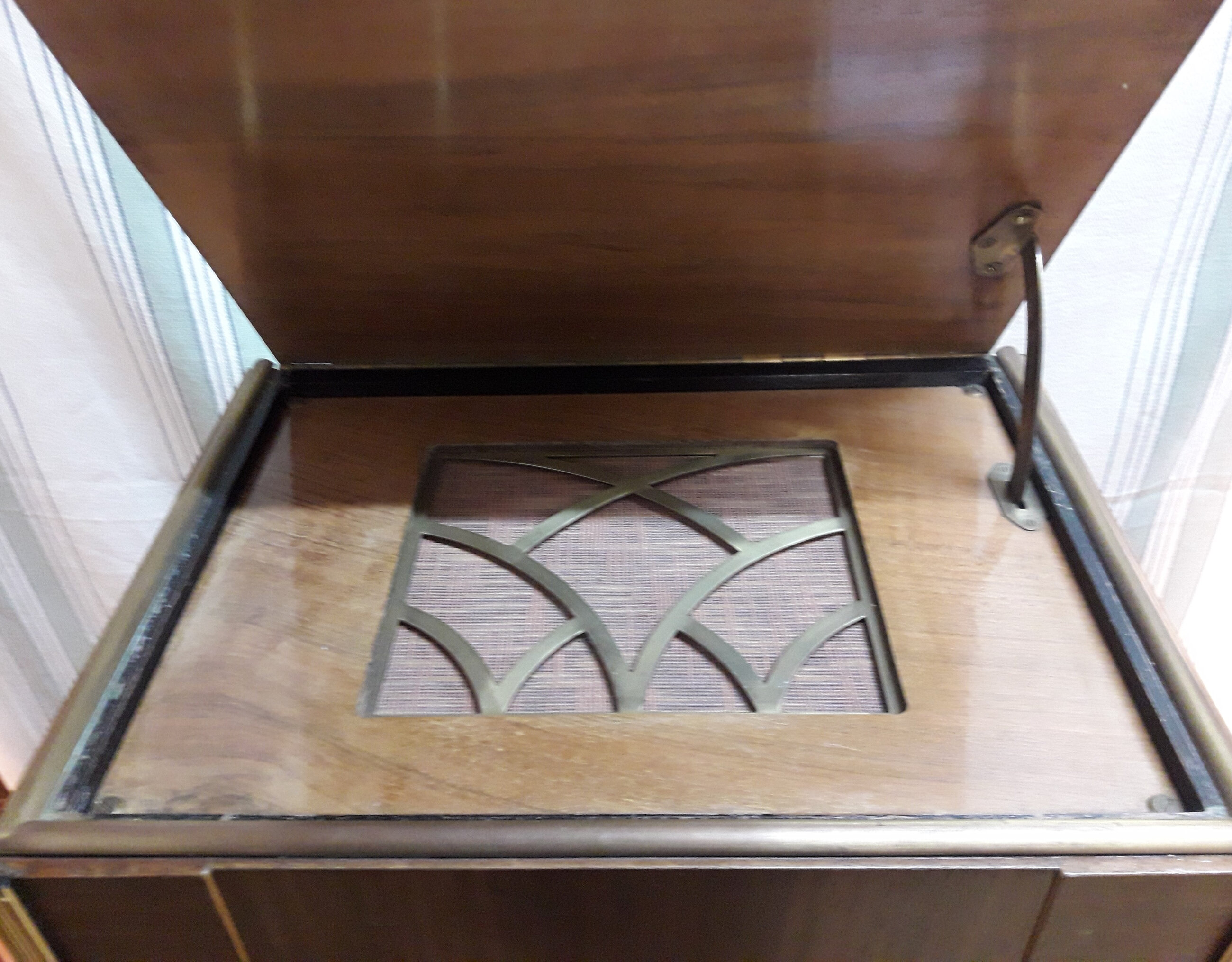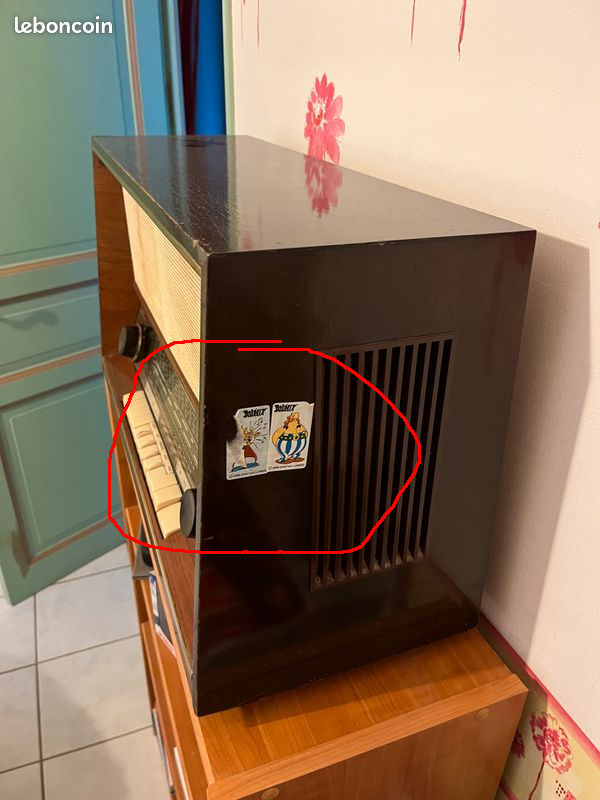 , non pas le moins du monde, il est spécial pour ses baguettes latérales récupérées sur une armoire. le placage était trop ébréché en bordure, j’ai tenté cette modif parce que l’entourage et les pieds étaient de la même couleur doré. deux baguettes de chaque côté collées. dommage ,il me manque le panneau arrière. il venait de l’artisan qui m’a fait l’électricité de la maison il y a 30 ans mais n’a été restauré que l’an dernier avec l’aide michel pour la partie électrique. modèle original avec le hp vers le haut, d’autres marques l,on fait aussi a cette époque.