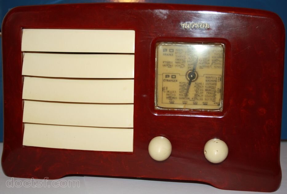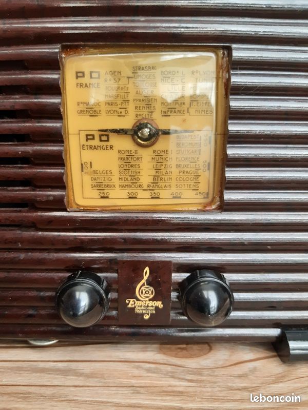 Une variante du modèle Emerson Little Miracle avec un cadran PO « France » et PO « Etranger ». Sans doute un cadran francisé car aux US PO n’est pas utilisé et lorsqu’il y a plusieurs bandes, les PO sont appelées « Broadcast ».